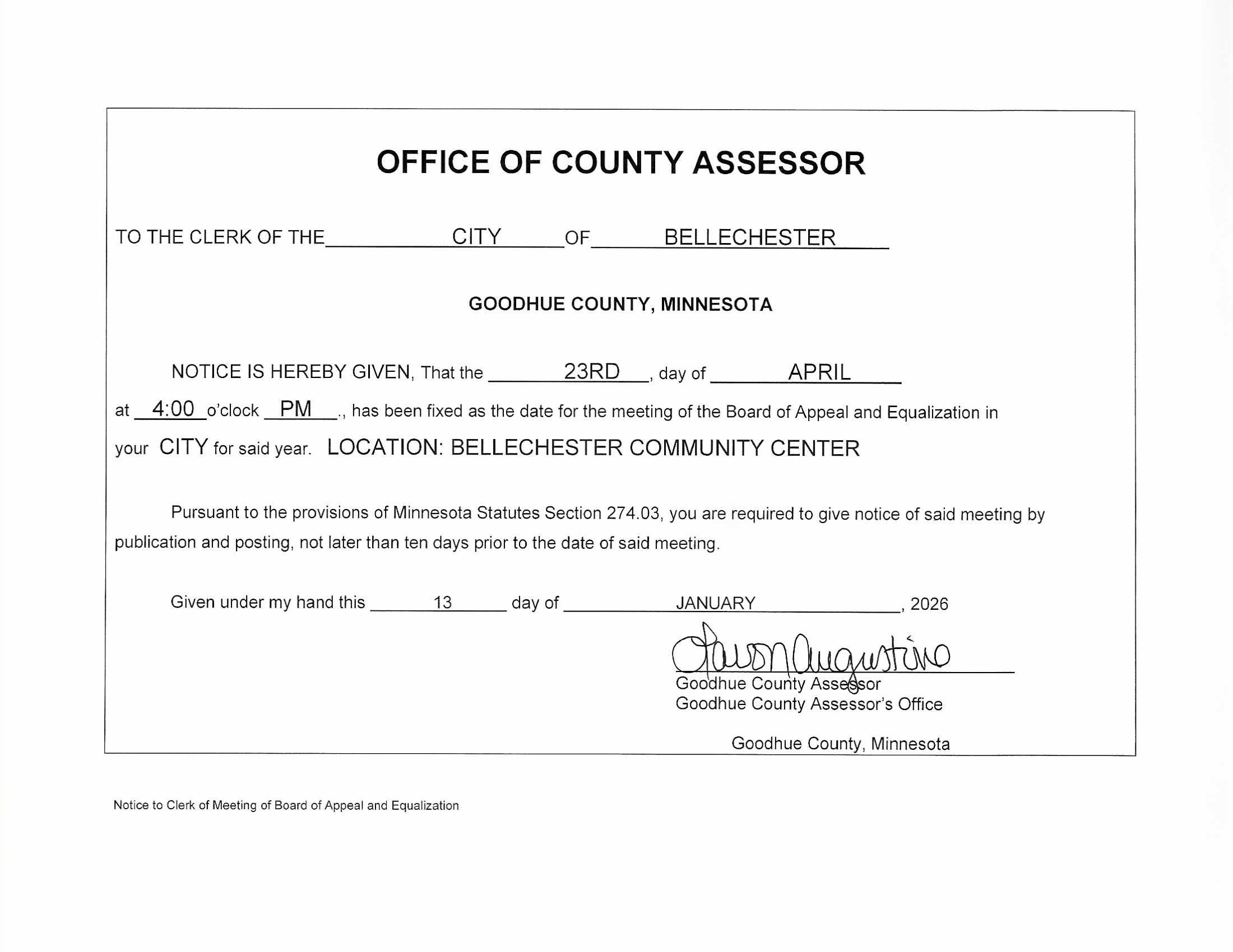 Regular City Council Meeting Our April council meeting will be moved to same date as the Board of Equalization Meeting for Goodhue residents in Bellechester on April 18th @ 4:30. It will occur after the BOE meeting with a limited agenda.